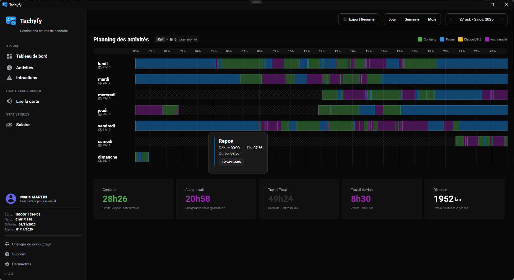 - 📊 Timeline visuelle de vos activités (conduite, repos, travail, dispo)